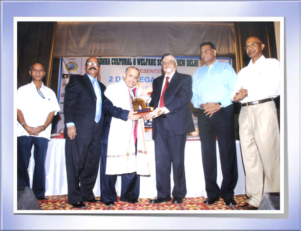Mr. Surinder Mehta, being felicitated with “Pragya Puraskar” by Hon’ble Justice P. Sathasivam, Justice, Supreme Court, at a function organized by Andhra Cultural and Welfare society at New Delhi on 25th April 2009.Also seen in the photograph is Mr K Padmanabhaiah, Former Home Secretary - Govt. of India, Mr P. Abraham, Former Power Secretary – Government of India and Mr. C.R. Prasad, Former CMD, GAIL present on the occasion. |