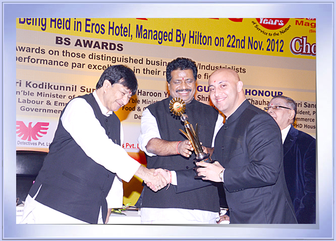 Mr. Rohan Mehta, Managing Director, Prime Electric Ltd.,being awarded the Young Entrepreneur of the Year by Shri Kodikunnil Suresh, Minister of State for Labour & Employment, Government of India and Shri Haroon Yusuf, Minister for Power, Food & Civil Supplies, Development, N.C.T of Delhi.